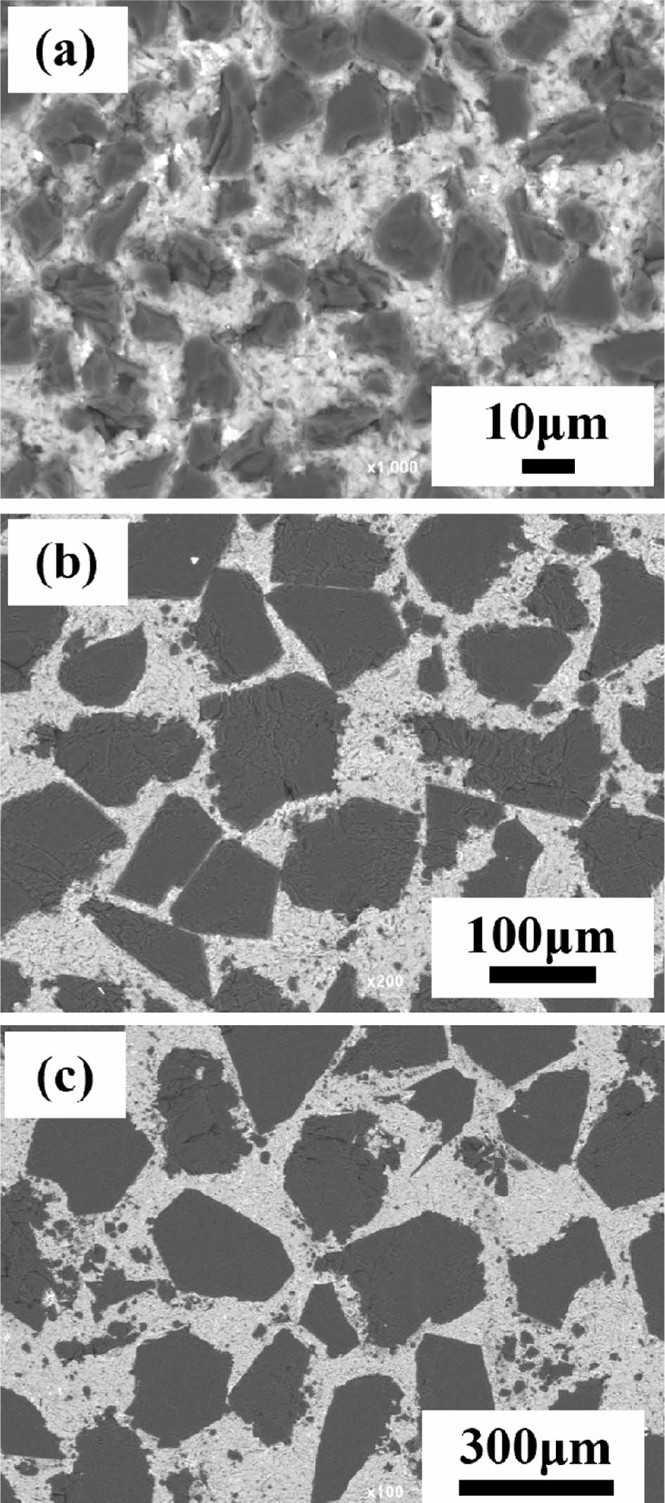 Fig. 3 SEM Microstructures of 60 vol.% cBN/Al1050 composites with different cBN particle size: (a) 15 μm, (b) 100 μm, (c) 300 μm |