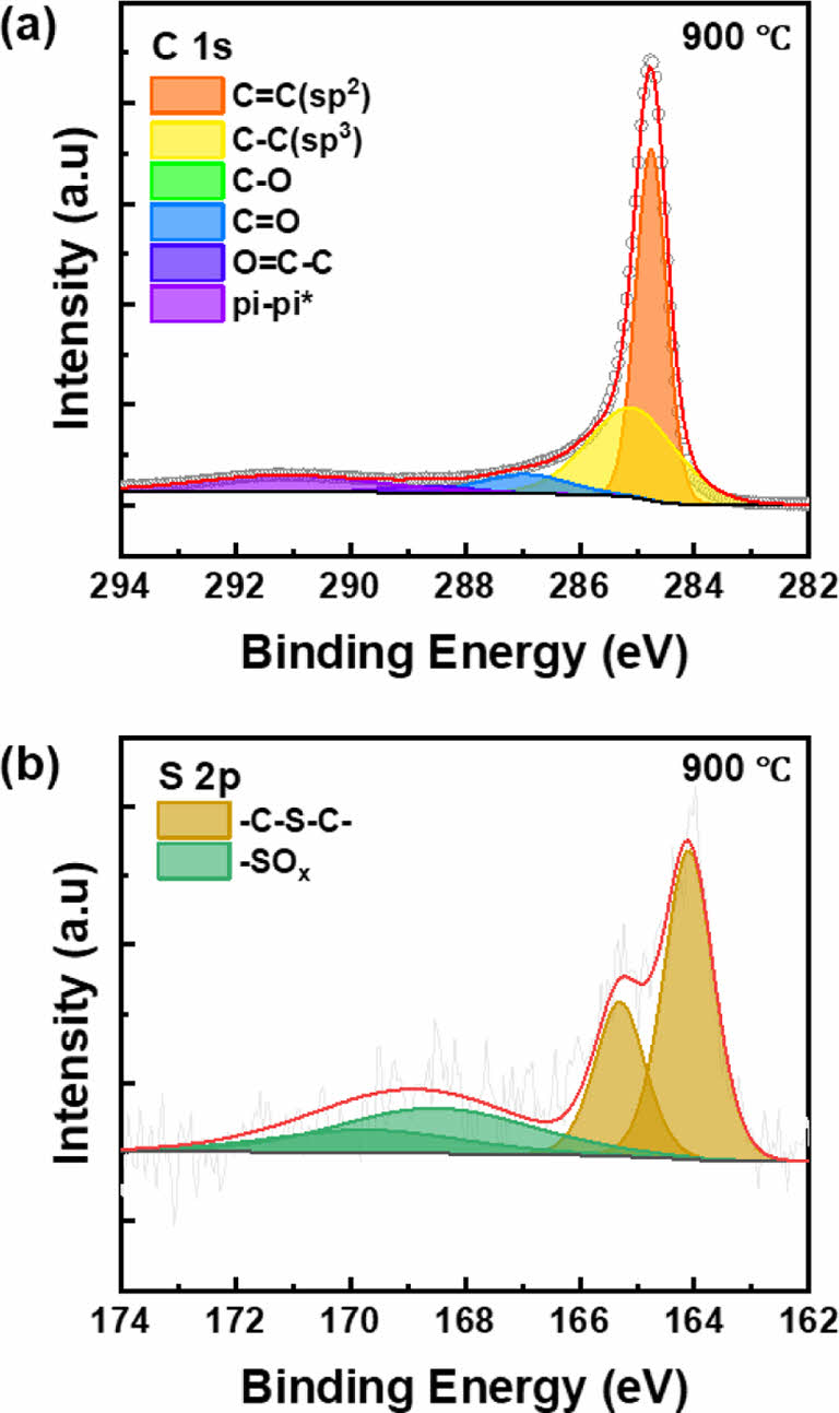 X선 광전자 분광법(XPS, X-ray photoelectron spectroscopy)을 이용하여 황 도핑에 따른 VG@CNF의 화학적 변화를 분석하였다. Fig. 3a와 3b는 VG@CNF에 티오우레아를 900oC에서 열처리한 샘플의 C 1s와 S 2p의 XPS 스펙트럼을 보여준다. C 1s 스펙트럼에서는 284.8 eV(C=C, sp²), 285.1 eV(C-C, sp³), 286.5 eV(C-O), 287.0 eV(C=O), 288.6 eV(O=C-O)의 위치에서 피크가 관찰되어[20-22], 그래피틱 구조를 나타내는 C=C 피크와 함께 일부 결함 및 산소 작용기를 포함하고 있는 것을 확인하였다[23].