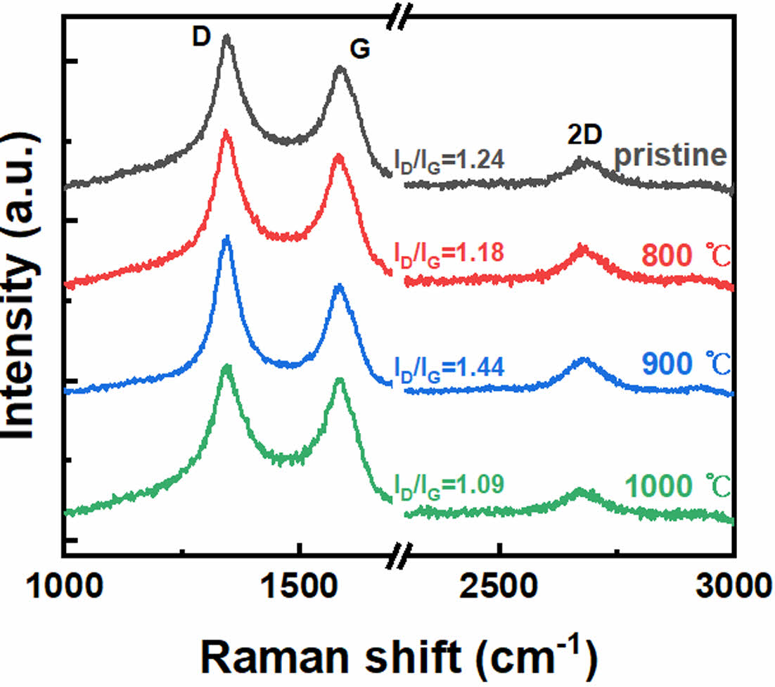 그래핀의 질소 도핑에서는, 그래핀 내 산소 작용기가 전구체의 열분해된 활성 반응물과 반응하여 질소 도핑된 그래핀을 형성한다고 보고되었으며[27], 그래핀 구조를 회복할 만큼 충분한 고온의 온도가 필요하다고 알려져 있다[28]. 이를 근거로 티오우레아 또한 유사한 메커니즘을 따라 결함을 생성할 것이라 가정하였을 때, Fig. 5에서 나타난 것처럼 1000oC 온도에서는 산소 작용기와 같은 결함 부위가 과도하게 환원되어 황 치환을 위한 자리가 부족하고, 800oC에서는 VG@CNF의 그래핀 구조가 황 원소를 포함한 상태로 회복되기에는 낮은 온도인 것으로 보인다.