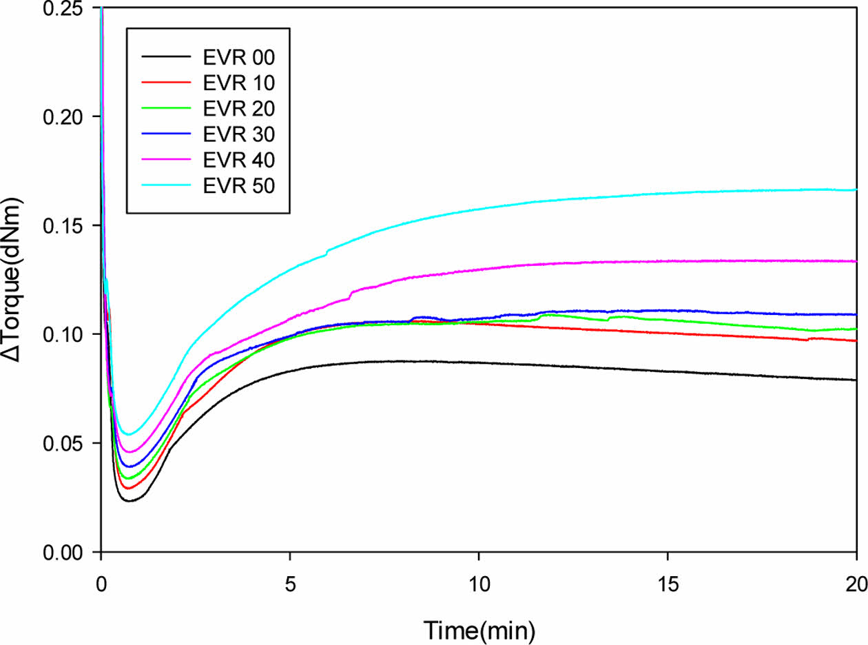 LWP is a previously crosslinked recycled EVA foam, with a molecular weight distribution and crystallinity differ from those of neat EVA. In addition this suggests that the residual cross-linked structure, which was not completely decomposed, formed microgels, contributing to the increase in ΔTorque.