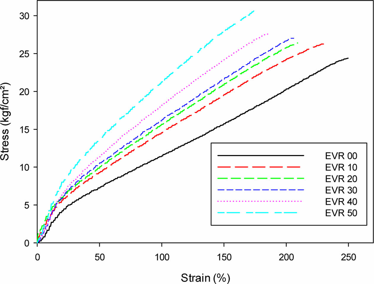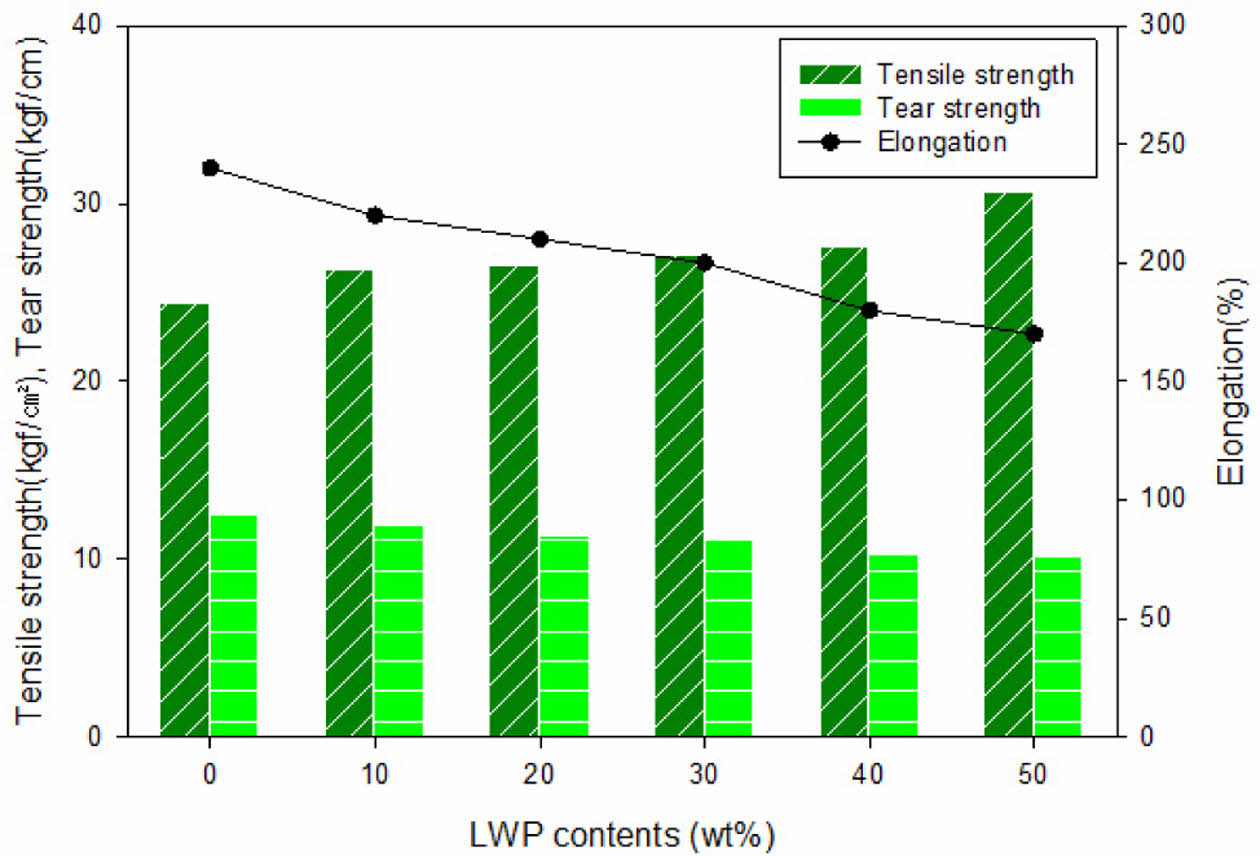 According to ODR measurements, the crosslink density increased with higher LWP content, contributing to improved tensile strength and mechanical stability. However, phase separation between EVA and LWP appeared to reduce elongation at break and tear strength, reflecting the complex interplay between increased crosslink density and phase separation.