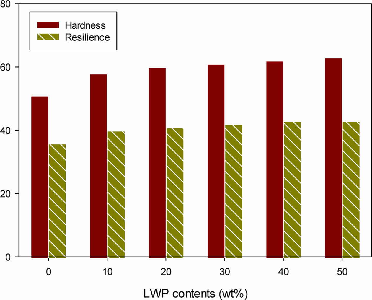 Fig. 6 Hardness and Resilience of EVA and EVA/LWP composite foams |