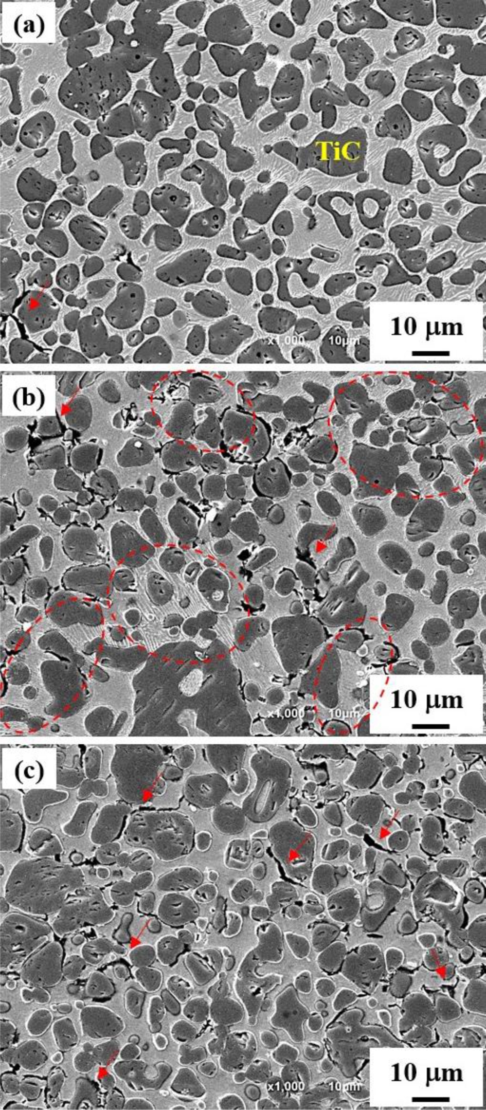 Fig. 3 SEM microstructure images of TiC/Fe composites with different Si contents: (a) 0.8 wt.%, (b) 1.5 wt.%, and (c) 2.5 wt.% |