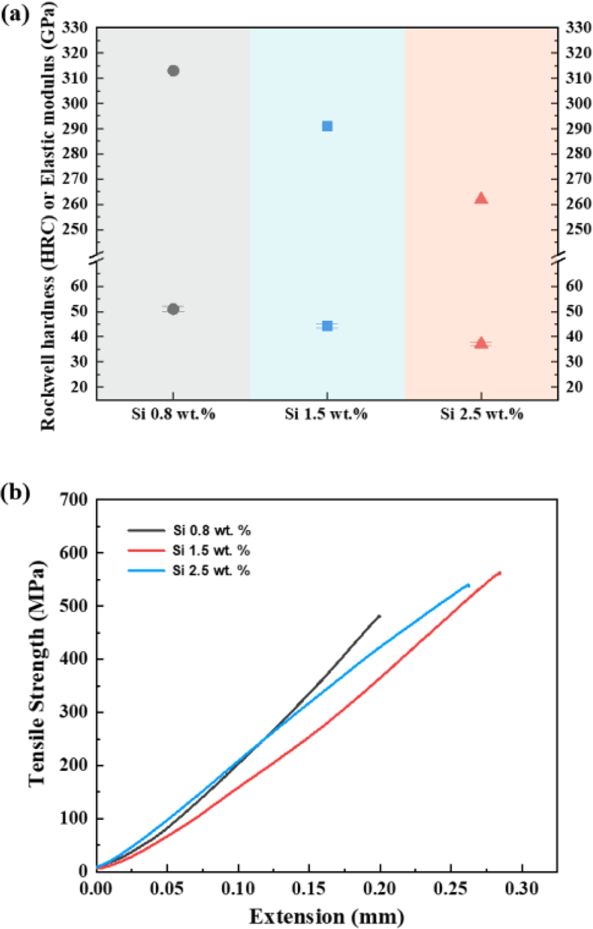 Fig. 4(b)에 제시된 인장시험 결과에 따르면, Si 1.5 wt.% 시편에서 559.6 MPa로 최대 인장강도를 나타냈다.