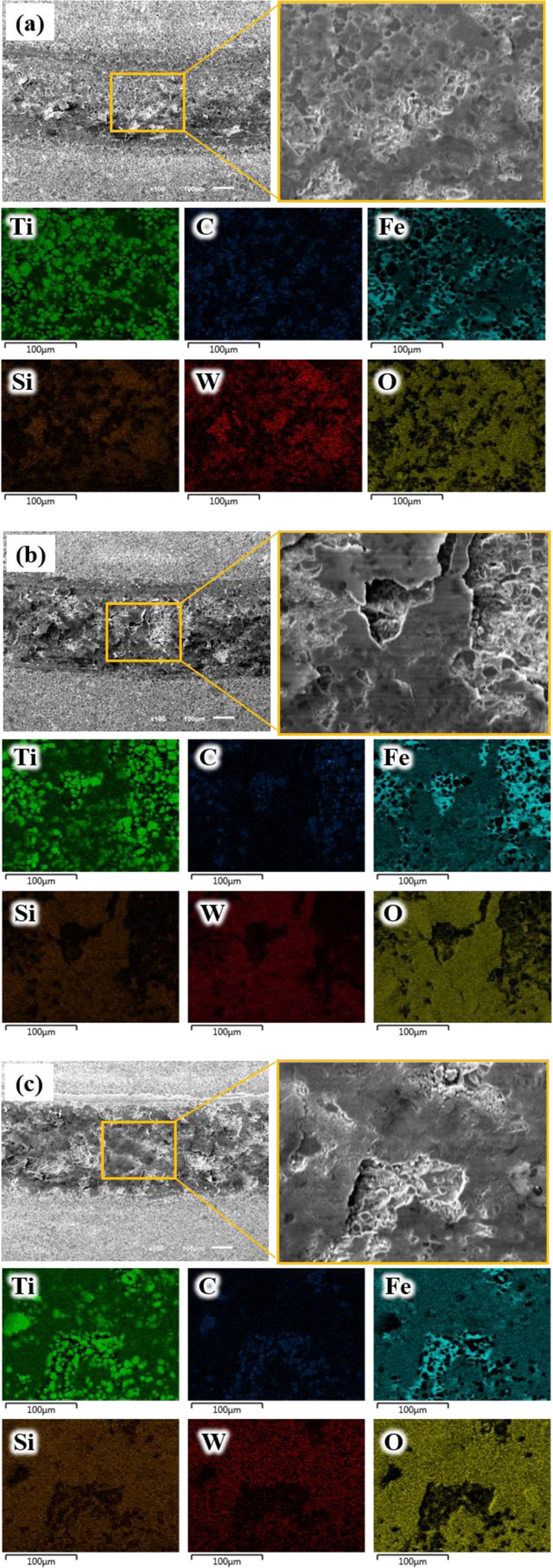 Fig. 5 SEM-EDS analysis results of the wear track for TiC/Fe composites with different Si contents: (a) 0.8 wt.%, (b) 1.5 wt.%, and (c) 2.5 wt.% |