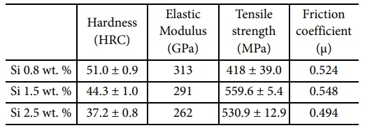 결과적으로, Si 함량 증가는 시멘타이트 억제와 흑연 석출 촉진을 통해 경도와 탄성계수를 감소시켰다. 반면, 인장강도는 펄라이트와 페라이트가 적정 비율로 혼합된 경우 강도와 연성이 균형을 이루어 인장강도가 향상되었으며, 흑연의 증가로 마찰계수가 감소하는 경향을 나타냈다. 특히 Si 함량이 2.5 wt.% 시편의 경우 낮은 경도에도 불구하고 인장강도가 1.5 wt.% 시편의 최대값과 유사한 수준을 유지하면서도 마찰계수가 가장 낮아, 마모 저감이 중요한 응용 환경에서 유리한 특성을 가질 수 있음을 시사한다.