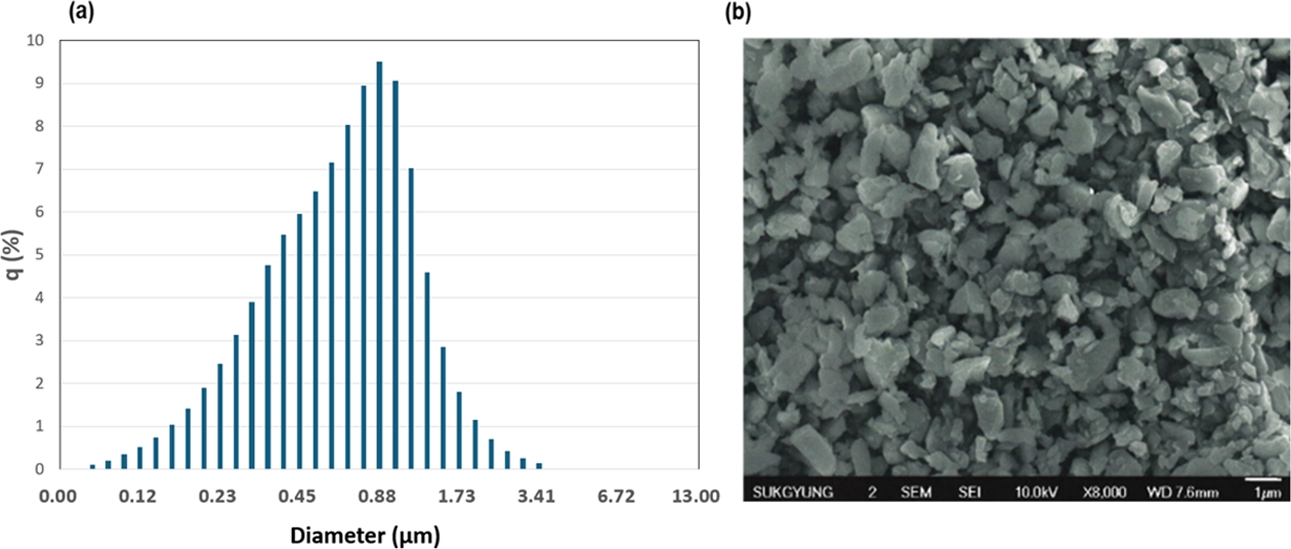 This study utilized Barium glass nanoparticles (Sukgyung AT, Korea), including BaO, α-Al2O3, and amorphous SiO2. The average particle size was 800 nm and the corresponding standard deviation was 0.46 µm. Fig. 1 illustrates the particle size distribution and morphology of the nanomaterials. The particle surfaces were modified with the silane coupling agent 3-(Trimethoxysilyl) propyl methacrylate (CAS No. 2530-85-0), which contains methacryloxy groups (Sigma Aldrich). Additionally, urethane-based oligomers were synthesized in-house.