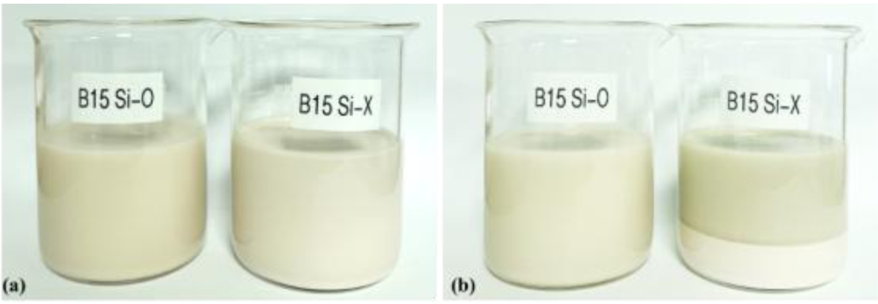 After 24 h of standing, the sedimentation was assessed. The results shown in Fig. 9(b) demonstrate that the resin containing the silane-coupling-agent-treated powders exhibited no particle sedimentation, maintaining good dispersion. In contrast, the resin with untreated powders failed to maintain dispersion, resulting in particle sedimentation at the bottom of the beaker.