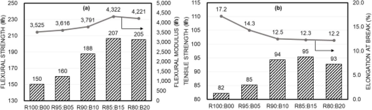 Fig. 13 (a) Flexural strength and flexural modulus results of 3D printed object with different R/B particle ratio. (b) tensile strength and elongation at break result of 3D printed object with different particle ratio |