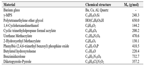 To achieve an A2 shade similar to natural teeth, the synthesized oligomers, monomers, photo initiators, and two types of organic pigments were mixed, with their types, chemical structures, and average molecular weights summarized in Table 1. Barium glass was added to the photocurable resin in varying proportions to create five sample compositions, R100:B0, R95:B5, R90:B10, R85:B15 and R80:B20, which were then used for comparative analysis of mechanical properties.