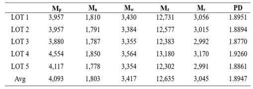 In panel (b), the spectrum of the completed oligomer is presented. Here, the NCO characteristic peak at 2,270 cm-1 disappears, and a peak corresponding to the N-H bond, indicative of urethane linkages, appears at 3,370 cm-1 [24], confirming the completion of the synthesis. The results of Gel Permeation Chromatography (GPC) analysis of the synthesized oligomer are illustrated in Fig. 8, revealing an average molecular weight (Mw) of 3,417 g/mol. The detailed measurement results are summarized in Table 2.