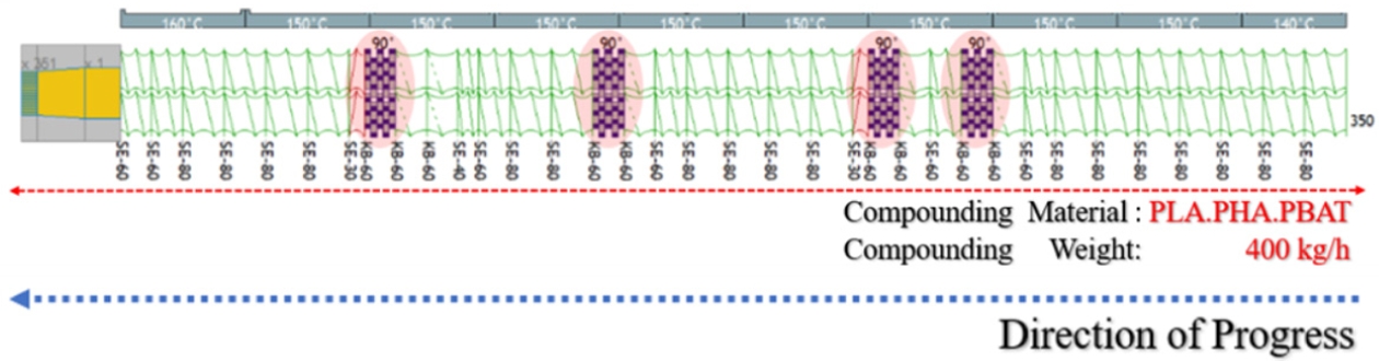 Twin-Screw Extruder (TSE)는 생분해성 고분자 및 복합소재의 혼련과 분산 공정에서 핵심적인 역할을 수행하는 장비로, 스크류 직경, 회전수, 스크류 프로파일, 혼련 블록의 설계 등 다양한 공정 변수에 따라 최종 소재의 품질이 결정된다[3]. 특히 TSE의 혼련 요소 설계와 프로파일 최적화는 공정 중 전단속도, 체류시간 분포, SME (Specific Mechanical Energy) 등에 직접적으로 영향을 미치며, 이를 적절히 최적화하지 않으면 스케일업 과정에서 균일한 물성을 확보하기 어렵다.