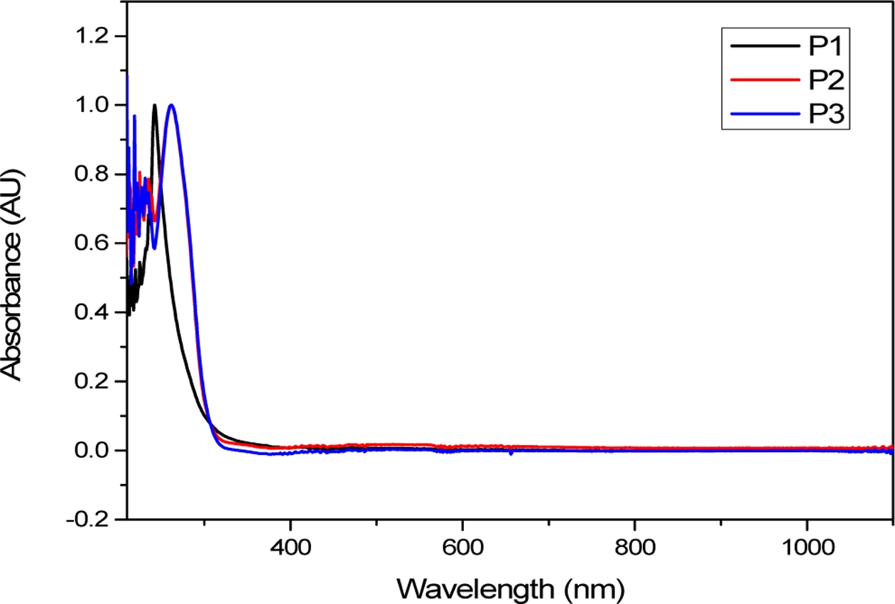 Fig. 4 UV-Vis absorption spectra of polymers (P1-P3) |