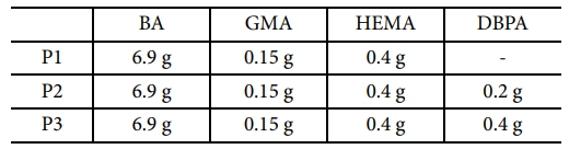 2구 플라스에 단량체들(BA, GMA, HEMA, DBPA)를 Table 1과 같은 조성비로 투입하였다. 이후 개시제(benzoyl peroxide) 0.1 g 및 반응 용매(etheyl acetate) 100 mL를 투입하였다. 이후 반응기에 있는 산소를 제거하기 위해 질소를 주입하며 상온에서 magnetic stirrer를 이용하여 300 rpm의 속도로 30분동안 교반하였다. 이후 혼합액을 질소 분위기하에서 70-75oC를 유지하며 8시간동안 반응을 진행하였다. 생성된 고분자의 구조는 Fig. 2에 나타내었다.