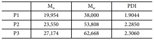 합성된 고분자 P1, P2, P3의 분자량 분포를 Table 2에 제시하였다. Table 2에서 확인할 수 있듯이, 아크릴 고분자의 분자량은 38,000–62,668 g/mol 범위에 있으며, DBPA 함량이 증가함에 따라 Mn과 Mw가 모두 증가하는 경향을 나타냈다[11]. 이러한 분자량 증가 현상은 단순한 가교 효과에 의한 결과라기보다 여러 구조적·반응적 요인이 복합적으로 작용한 것으로 판단된다. 첫째, DBPA의 높은 방향족성 및 부피성(bulkiness)은 라디칼 중합 과정에서 사슬 성장 경로와 반응 속도에 영향을 미쳐 상대적으로 더 긴 사슬 형성을 유도할 수 있다. 둘째, 공중합계에서 단량체 간 반응성의 차이로 인해 feed 조성과 실제 고분자 조성 사이에 불일치가 발생하며, 이는 Mn 및 Mw의 동반적 증가로 이어질 수 있다. 셋째, GMA 함량이 동일함에도 불구하고 후처리 단계에서 발생하는 에폭사이드–페놀 반응은 사슬 간의 국부적 결합 및 상호작용을 증가시켜 Mw 증가에 기여한 것으로 해석된다. 즉, DBPA 도입에 따른 분자량 증가는 가교 가능성뿐 아니라 구조적 특성과 반응성 차이에 기반한 복합적 메커니즘의 결과로 이해될 수 있다.