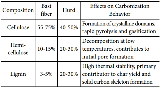 Table 1 Compositions of hemp bast fibers and hurds and their effect on carbonization behavior |