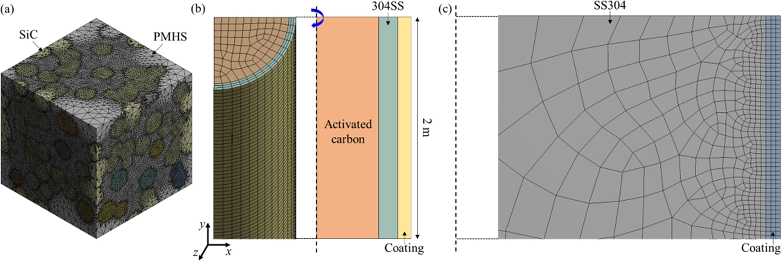 The estimated properties of the coatings were used as inputs for analysis with the macroscale column model. The effects of the coatings on the cooling efficiency of the columns and on the thermal stress at the interface between the column surface and the coated materials were investigated. Heat transfer analysis was performed to predict the time required to cool the column surface to 30 °C. A column with a length of 2 m was filled with a CO2-absorbing medium (activated carbon) and covered by ceramic particle–containing coatings (Fig. 1b). A quarter of the column was modeled using cyclic symmetry. The absorbing medium and stainless steel were 12.7 and 1.2 mm thick along the x-axis, respectively. The coating thickness varied from 10 to 100 mm. The whole model, with an initial temperature of 75 °C, was cooled by convection and radiation through the coating surface. The convection coefficient of still air was 5 W/mm2. The top and bottom surfaces of the model were insulated. For thermal stress analysis, the temperature distributions as a function of time obtained from the heat transfer analysis were used as boundary conditions. A 2D axisymmetric model was built, as the stress evolution at the interface between the column and coating was of primary interest (Fig. 1c). The dimension of the column cross section was 12 × 12 mm2. The thermal stress that evolved after one cycle of heating and cooling was estimated.