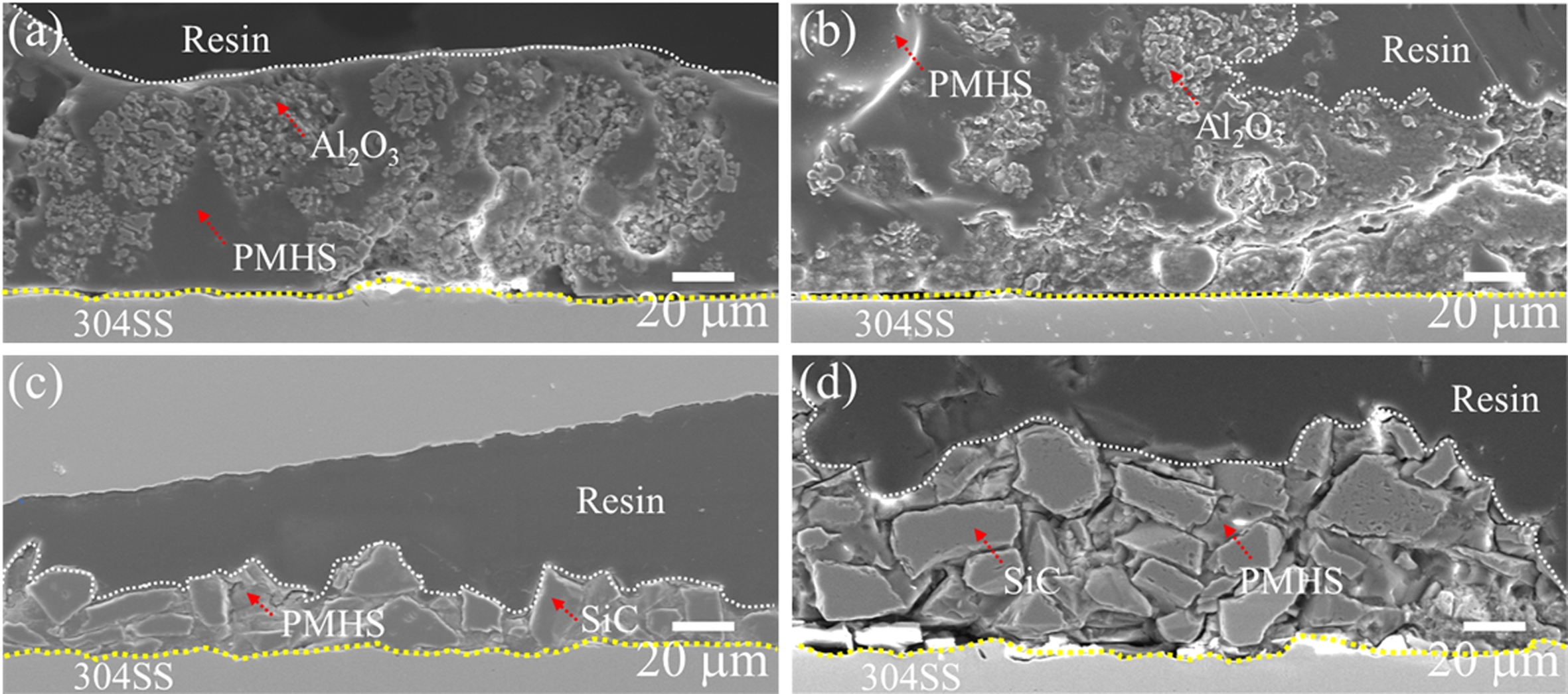 Fig. 6 SEM cross-sections of 304SS samples coated with (a) P4A6, (b) P5A5, (c) P4S6, and (d) P5S5. |