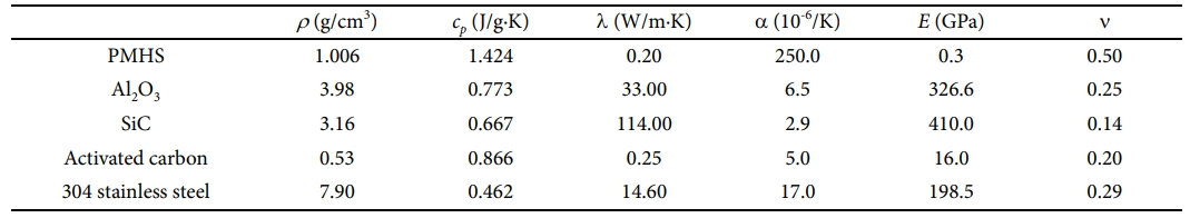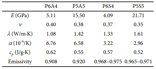 Poly(methyl)hydrosilane (PMHS) coatings were chosen for the study, with Al2O3 (average diameter = 2.1 μm, purity = 99%) and SiC (average diameter = 26.7 μm, purity = 98%) particles considered as additives. For microscale modeling, cubic 3D RVE models with randomly distributed ceramic particles were generated using a random algorithm. The particles had a 20-faced polyhedral shape, and their volume fractions were 40 and 50%, respectively. Particle overlapping was allowed to alleviate the limitations of the random algorithm when generating RVEs with high volume fractions of particles, while constraining the overlap to within 10% of each particle volume to preserve microstructural realism. The edge lengths of the RVE models were 10.5 and 133.5 mm for coatings with Al2O3 and SiC particles, respectively. A typical RVE geometry is shown in Fig. 1a. The RVE model was subjected to a 0.1% tensile strain to estimate the elastic properties, including Young’s modulus and Poisson’s ratio, using appropriate boundary conditions [20]. To predict thermal conductivity, a heat flux of 1 W/m2 was applied to one outer surface of the RVE, while the temperature on the opposite surface was measured and the remaining surfaces were insulated. The specific heat capacity was estimated by applying a volumetric heat generation rate of 1 W/m3 under adiabatic boundary conditions. The axial displacements were measured to predict the coefficient of thermal expansion by increasing the model temperature to 100 °C. The material properties used for the analysis are listed in Table 1. All materials were assumed to be isotropic and linearly elastic. The PMHS coatings with 40 and 50 vol%Al2O3 or SiC are referred to as P6A4 and P5A5, and P6S4 and P5S5, respectively. The wavelength-dependent complex refractive indices of PMHS, Al2O3, and SiC were collected to estimate the coating emissivity [21-23]. The effective complex permittivity of the PMHS coating with Al2O3 was computed through the Bruggeman effective medium approximation [24], and then used to calculate the effective complex refractive index. The coating was assumed to be a homogeneous layer in contact with air, and transmission in the infrared was neglected. Under this condition, the total hemispherical emissivity was obtained by Planck-weighted spectral averaging over the thermal infrared band. Since the SiC particles considered in this study were larger than the dominant thermal radiation wavelengths, a particle-resolved radiative transfer approach combining Mie scattering theory and a d-Eddington two-stream model was used [25], which yielded the relationship between coating thickness and total hemispherical emissivity.
