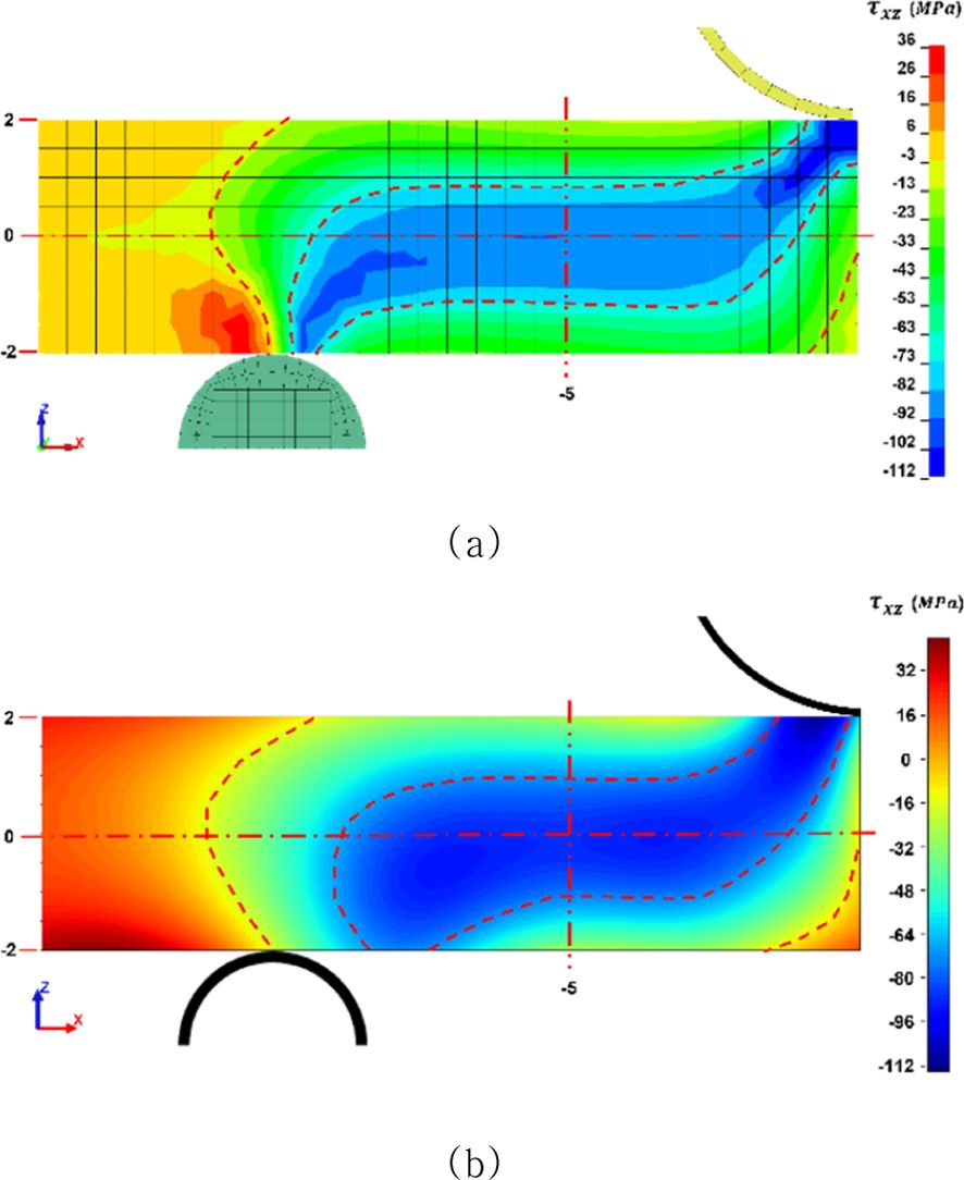 Fig. 5 Qualitative comparison of interlaminar shear stress at the max load: (a) τxz in FEA, (b) τxz in Hybrid PINN |