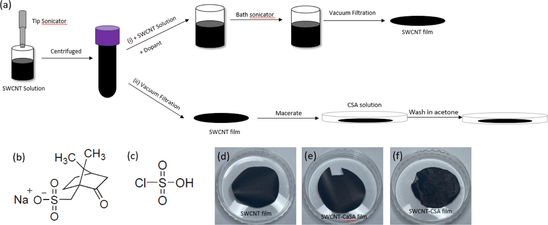 Fig. 1 (a) Schematic illustration of the SWCNT film fabrication and acid-doping processes. Chemical structures of (b) camphor sulfonic acid (CaSA) and (c) chlorosulfonic acid (CSA). Photographs of (d) pristine SWCNT film, (e) CaSA-doped SWCNT film, and (f) CSAdoped SWCNT film |