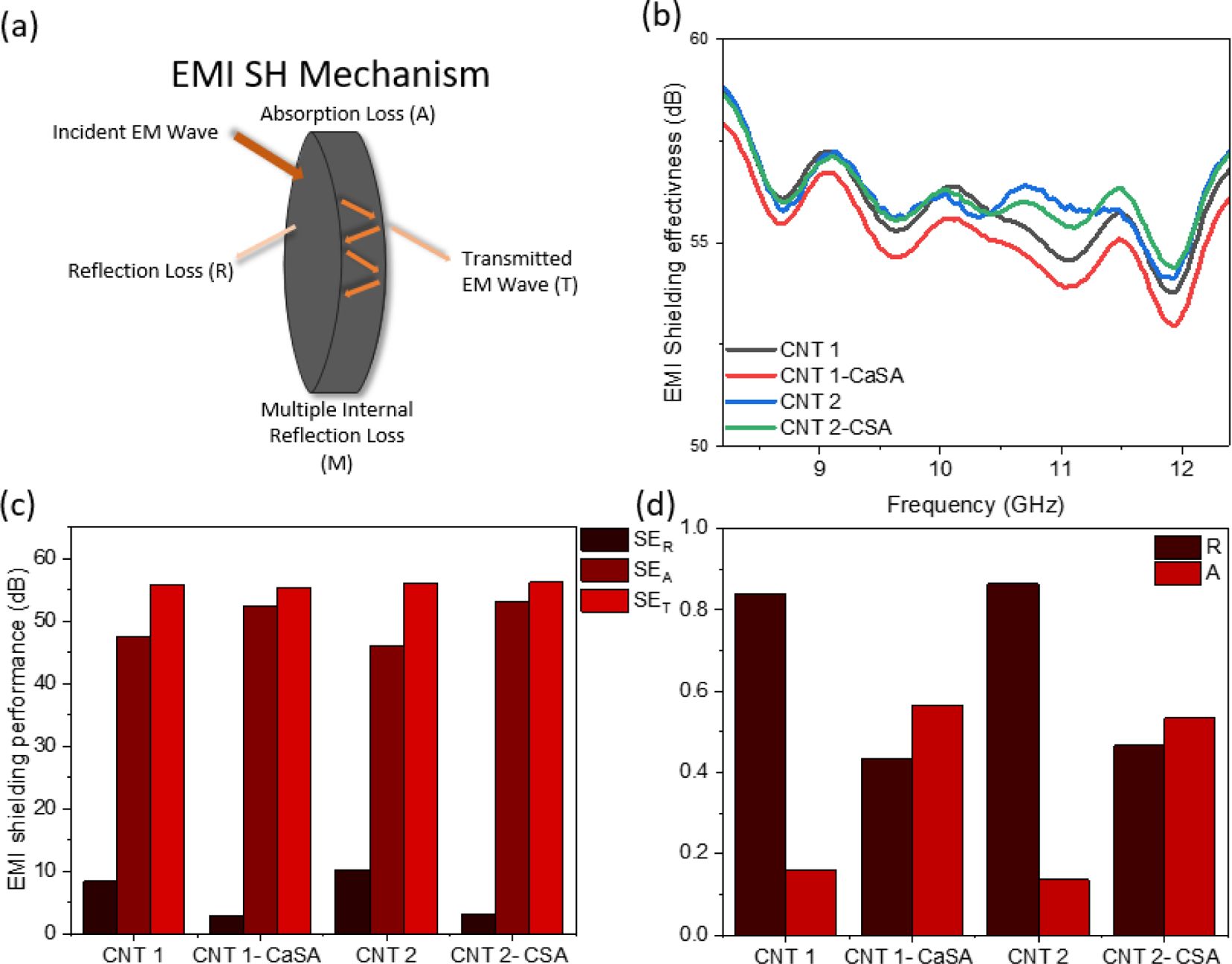 Fig. 2 (a) Schematic illustration of the EMI SH mechanism. (b) EMI shielding effectiveness (SET) of SWCNT, SWCNT-CaSA, and SWCNTCSA at frequencies ranging from 8.2-12.4 GHz.(c) Comparison of average reflection (SER), absorption (SEA), and total EMI shielding effectiveness (SET). (d) Average R and A coefficient value of SWCNT, SWCNT-CaSA, and SWCNT-CSA |