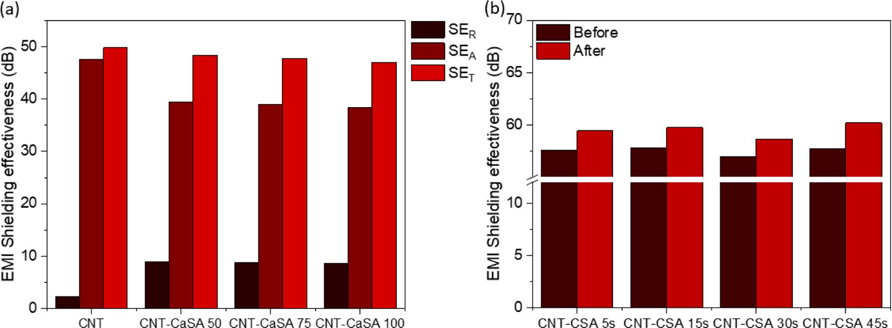 Subsequently, the effect of CaSA concentration on the EMI shielding effectiveness was investigated by increasing the CaSA concentration to 50, 75, and 100 mg mL-1 (Fig. 3a). The results show that, despite a several-fold increase in CaSA concentration, the total EMI shielding effectiveness remains essentially unchanged across all samples. Meanwhile, extending the maceration duration does not result in a monotonic increase in shielding effectiveness; the comparison between untreated and CSA-treated SWCNT films reveals an overall enhancement of approximately 2–3 dB after CSA maceration(Fig. 3b). However, the use of a strong acid such as CSA presents inherent challenges due to its high reactivity. CSA readily reacts with ambient moisture to generate HCl and H₂SO₄, and prolonged maceration times were observed to induce structural damage to the SWCNT films. These results indicate that while CSA post-treatment can modestly enhance EMI shielding, careful optimization of the maceration duration is required to balance performance improvement and structural integrity.