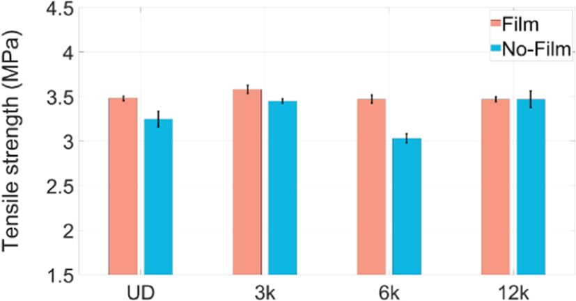The mean interfacial tensile strength varied significantly with both the face sheet architecture and the use of an adhesive film, and the corresponding strength values for each configuration are reported in Fig. 3. In all specimens manufactured with an adhesive layer, failure consistently occurred within the core material irrespective of the face sheet type, indicating that the interface strength exceeded that of the foam core and that a reliable bonding condition was achieved.