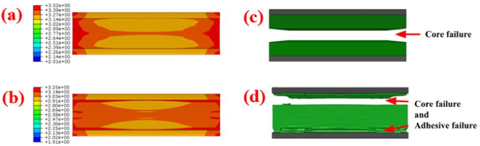 It should be noted that the finite element model was developed and quantitatively validated primarily for the UD configuration, which exhibited the most critical interfacial behavior in the experimental observations. Accordingly, the predictive capability of the present modeling approach is limited to UD-based sandwich specimens, and direct extension of the current model to woven CFRP face sheet configurations is beyond the scope of this study.