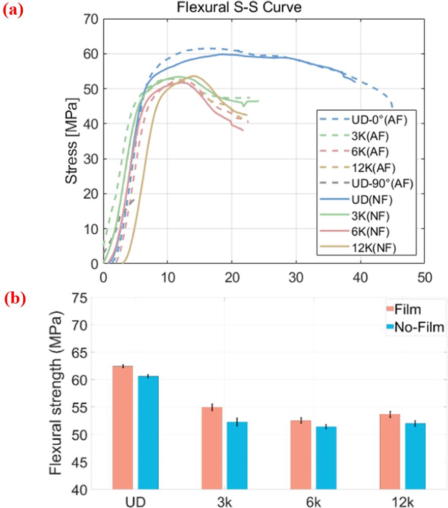 Fig. 5 Maximum flexural strength: (a) Flexural S-S curve (b) Flexural strength |