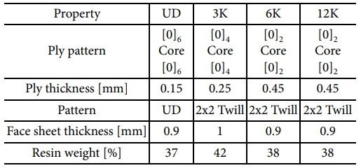 The sandwich composites investigated in this study were fabricated through a one-shot co-curing process [8], in which the CFRP face sheets and PVC foam core was cured simultaneously. Four types of epoxy-based CFRP prepregs UD tape and 3K, 6K, and 12K woven fabrics were employed as face sheet materials. These prepregs were selected to examine how differences in fiber architecture, areal weight, and resin distribution influence the formation and mechanical behavior of the interface. Their key material characteristics, including ply thickness, fiber pattern, and resin content, are summarized in Table 1. Variations in fiber alignment and weave geometry lead to different resin flow and infiltration behaviors during curing, thereby affecting the microstructure and mechanical integrity of the bonded interface.