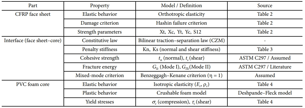 In terms of boundary conditions, the bottom surface of the lower face sheet was rigidly fixed, while a prescribed displacement was applied to the top surface of the upper face sheet to replicate the experimental loading condition. Both the face sheets and the core were discretized using eight-node reduced-integration solid elements (C3D8R), whereas the interface region was modeled with three-dimensional cohesive elements. The complete finite element model consisted of 8,092 elements in total. Detailed material properties employed in the simulations are summarized in Tables 2–4, and the applied boundary and loading conditions are schematically illustrated in Fig. 1.
