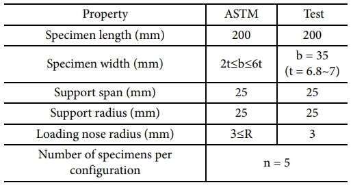 Three-point bending experiments were carried out to investigate the flexural response and interfacial integrity of the sandwich composite structures, following the procedures specified in ASTM C393/C393M [10]. This test method is commonly employed to characterize the coupled mechanical behavior of the face sheets, core material, and their interface when subjected to combined loading modes. The detailed specimen dimensions and three-point bending test configuration, including the support span, loading nose radius, support radius, and number of specimens per configuration, are summarized in Table 6.