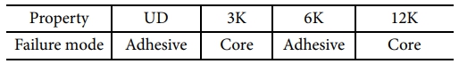The post-test failure characteristics are summarized in Table 7. For adhesive-free specimens with 3K and 12K woven CFRP face sheets, failure occurred predominantly through CFRP face sheet fracture without interfacial debonding, demonstrating effective load transfer and sufficient interfacial bonding strength even in the absence of an adhesive film. In contrast, interfacial separation along the skin–core boundary was observed only in UD- and 6K-related configurations, indicating comparatively weaker interfacial bonding in these cases. This behavior is attributed to differences in fiber architecture and resin distribution at the interface region, which can influence local stress transfer and bonding effectiveness.