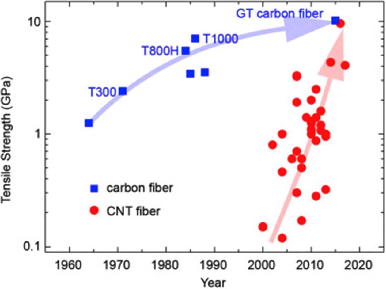 Fig. 1 Evolution of the tensile strength of CNTF and carbon fibers. Reproduced with permission [14]. Copyright 2018, Elsevier |