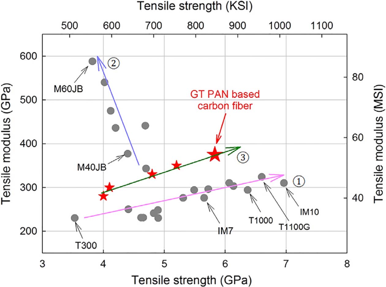 Fig. 2 Tensile strength versus tensile modulus of various PAN based carbon fiber. Reproduced with permission [34]. Copyright 2015, Elsevier |