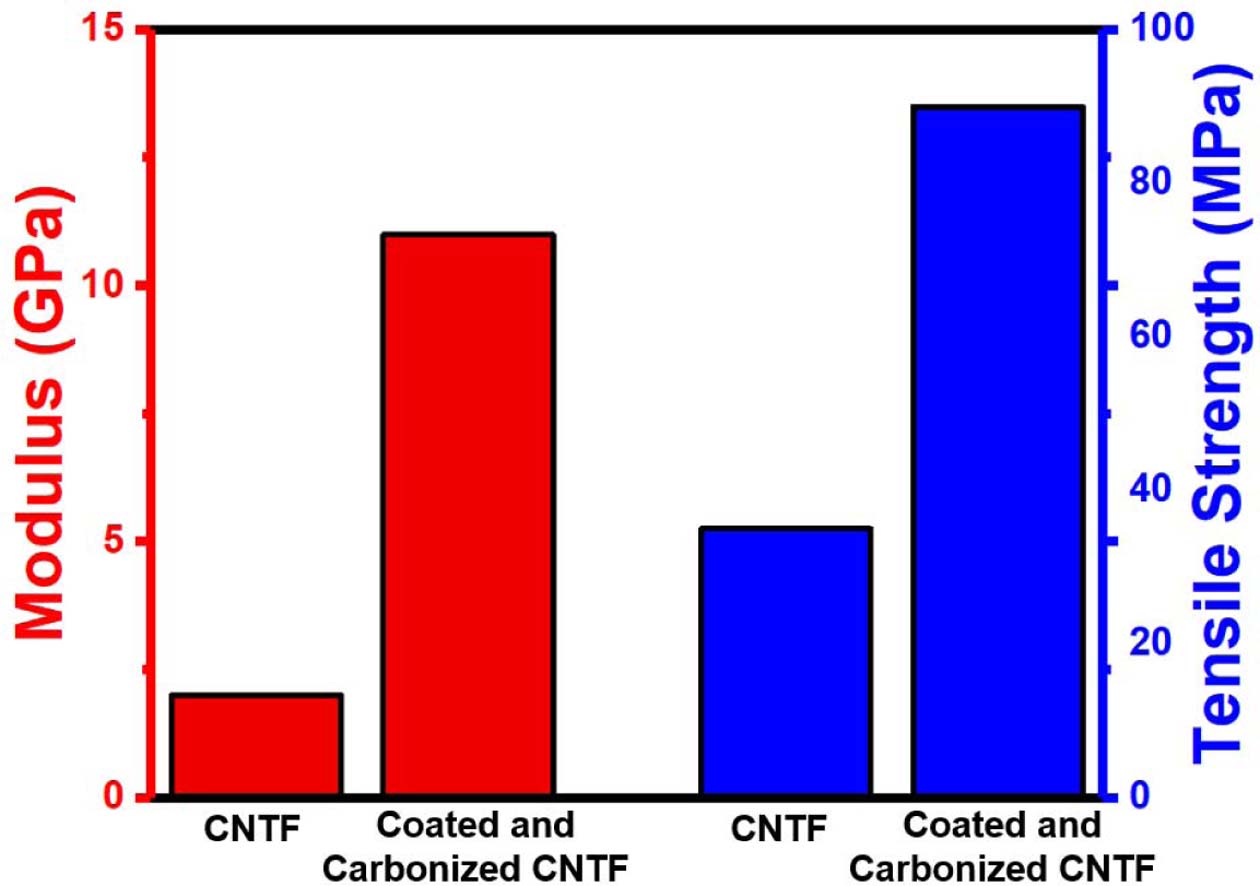 이와 같은 방법으로 코팅하였을 때 CNTF의 탄성률은 약 2 GPa에서 11 GPa까지 향상되었고, 강도는 35 MPa에서 90 MPa까지 대략 2.5배 가량 향상되는 것으로 보고하고 있다(Fig. 3). 이 경우 비교적 간단한 방법으로 탄성률과 강도를 향상시킬 수 있다는 장점이 있다.