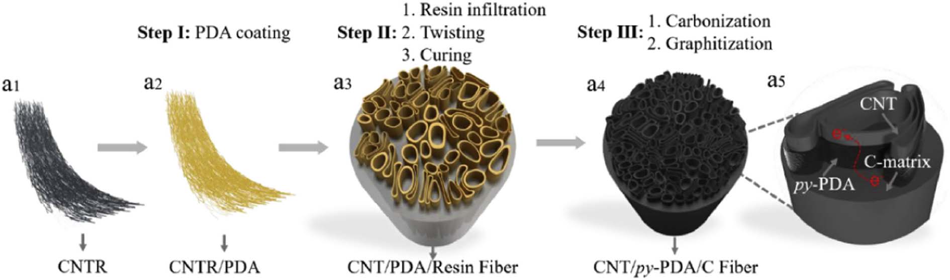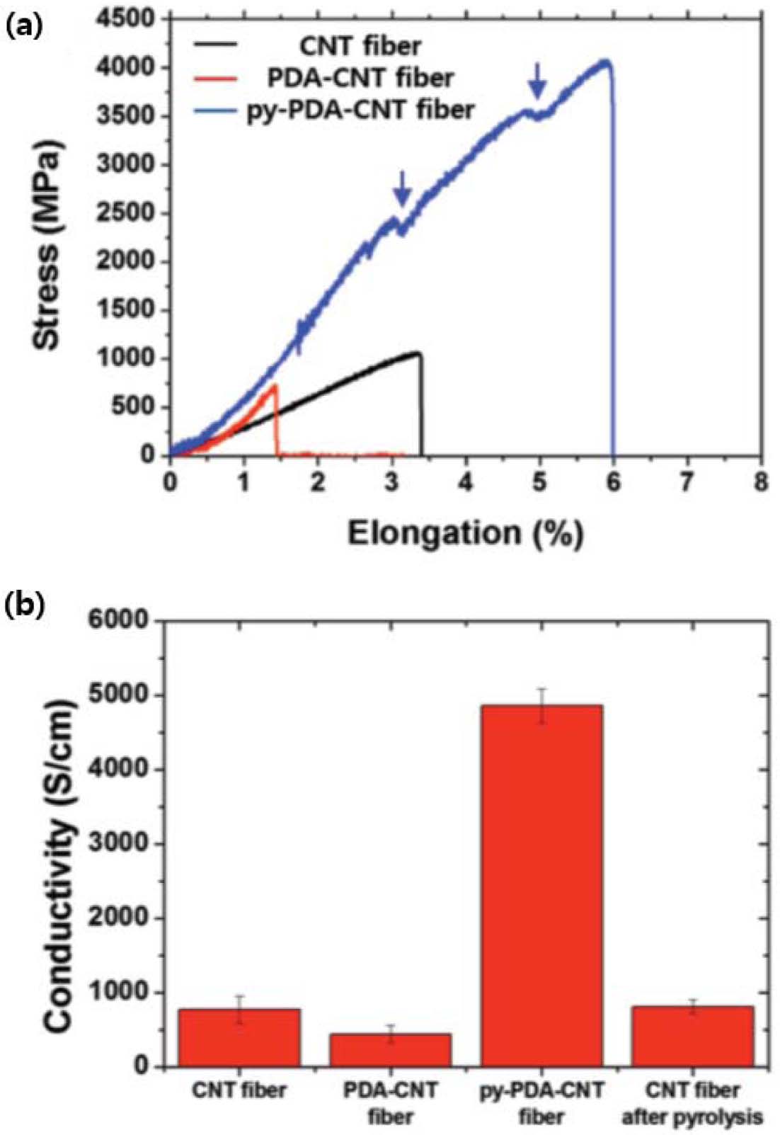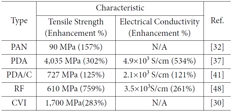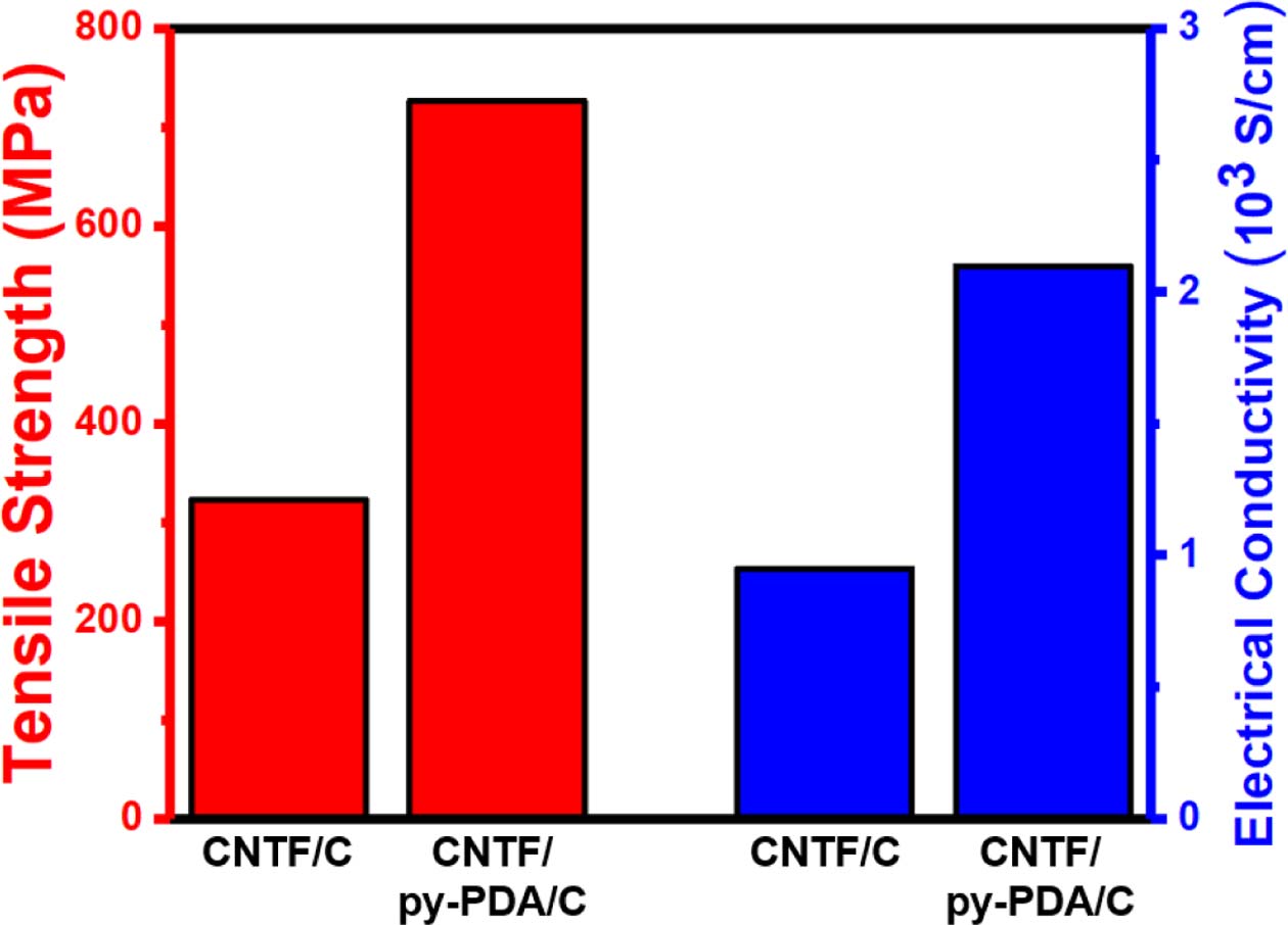 많은 연구들이 CNT와 탄소 소재(CNT/C)로 복합재료를 만들면서 높은 배향성과 밀도에 주목하여 강도 향상에 초점을 맞췄다. 하지만 강도 향상과 동시에 전기전도도를 향상시키는 것은 도전적인 과제 중 하나였다. 강도와 전기전도도를 동시에 향상시키기 위해 열처리된 PDA(py-PDA)를 CNTF와 페놀계 레진 사이에 접목시키는 연구가 보고된 바 있다[41].