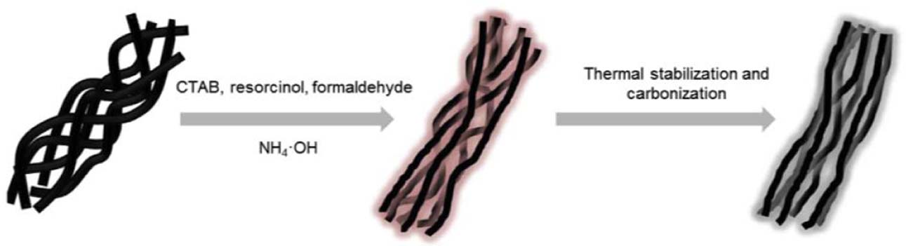 PDA와 같은 고분자를 고온에서 열처리를 해야 할 때, 많은 에너지 소비가 필요하며 비용적인 문제가 발생할 수 있다. 이러한 문제를 해결하기 위해서는 CNTF에 함침시킬 고분자를 선택하는 것이 중요하다. 이 경우에는 Fig. 8과 같이 RF 레진을 이용해서 PDA의 열처리 온도보다 더 낮은 온도인 600℃에서 열처리를 하여 비슷한 효과를 볼 수 있다는 장점이 있다. 이러한 방법을 이용했을 때 열 수축이 되며 높은 강도 및 전기전도도를 가지는 특징이 있다고 알려졌다[48].