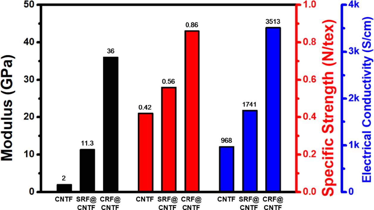 Fig. 9 Modulus, electrical conductivity, and specific strength of CNTF, SRF@CNTF(stabilized CNTF/RF) and CRF@CNTF (carbonized CNTF/RF). Reproduced from permission [48] |