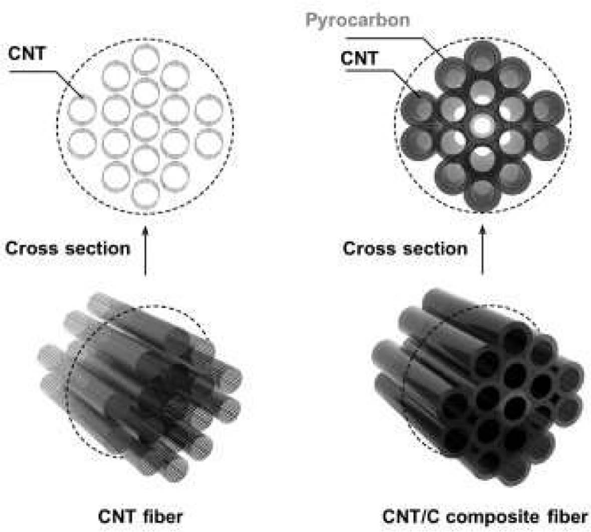 Fig. 10 Schemetic illustration of the CVI of pyrolytic carbon into a CNT fiber. Reproduced with permission [30]. Copyright 2016, Royal Society of Chemistry |
