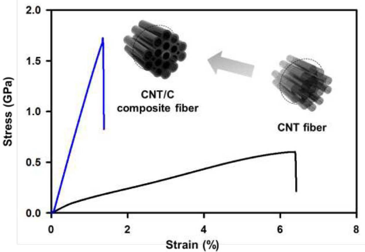 Fig. 11 Stress-strain curve of a pristine CNT fiber and a CNT/C composite fiber. Reproduced with permission [30]. Copyright 2016, Royal Society of Chemistry |