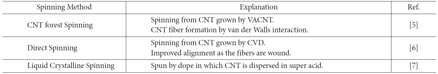 Table 1은 탄소나노튜브 섬유 제조 방법과 관련 연구 결과를 나타내고 있다.