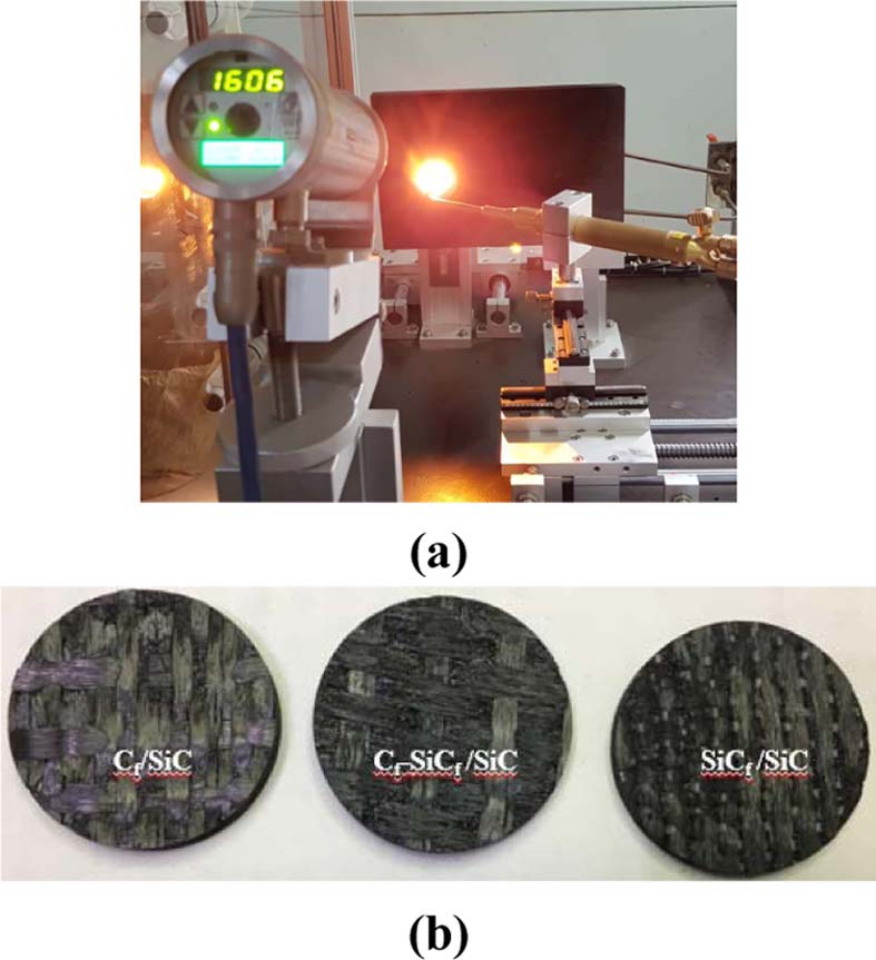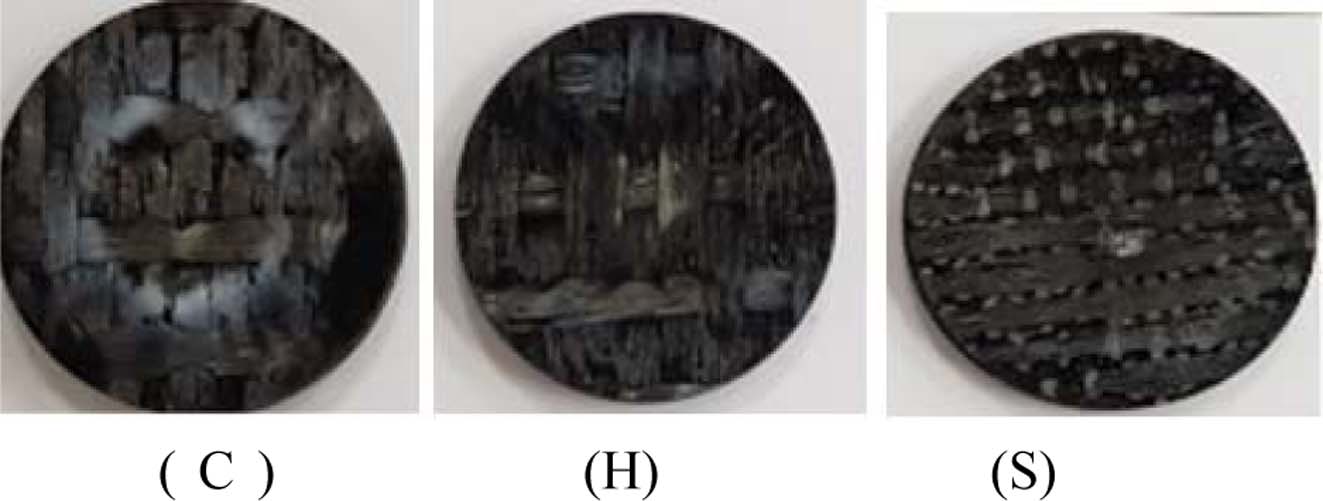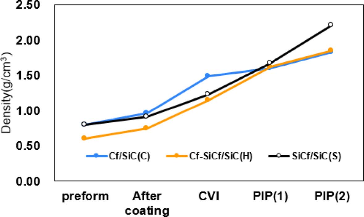 추가 밀도화는 PIP 공정을 사용하였다. 함침제로는 ㈜데크카본이 합성한 중량평균분자량(Mw)가 3,000이며, 연화점 190~210℃(Mettler Toledo90)인 PCS 전구체를 사용하였다. CVI로 밀도화 처리 한 제품을 흑연 도가니에 넣고, 여기에 PCS 파우더를 채우고 HIP(Hot Isotactic Press) 장비에 장입하고 온도를 20℃/min 속도로 700℃까지 올리고 900 atm의 압력으로 4시간 동안 함침/탄화를 하였다. 이후 질소분위기에서 1,200℃의 퍼니스에서 열처리를 하였다. 이와 같은 공정을 2회 반복 수행하여, 최종 Cf/SiC(C로칭함), Cf-SiCf/SiC(H로 칭함)과 SiCf/SiC(S로 칭함) 3종류의 세라믹 복합재를 제조하였다.