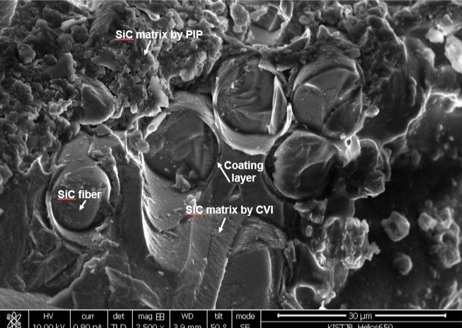 세라믹복합재(CMC)는 주로 PIP(Polymer Impregnation & Pyrolysis), CVI(Chemical Vapour Infiltration) 및 SMI (Silicon Melt Infiltration) 공정에 의하여 제조한다[21]. PIP공정은 프리폼에 고분자 프리-세라믹 전구체를 반복적으로 함침과 열분해를 수행하여 기공을 채우는 방법으로서 이 공정은 저렴한 제조 비용이 큰 장점이나, 잔류 기공율이 높고 열전도도가 낮고 매트릭스 구조가 주로 무정형이라는 단점이 있다. CVI 공정은 가스상의 전구체를 섬유의 표면 혹은 프리폼 내부를 채우는 것으로 열적, 기계적특성이 우수하고 결정성 구조의 매트릭스를 형성하지만, 제조단가가 높고 그리고 이 또한 높은 기공률을 갖는 단점이 있다.