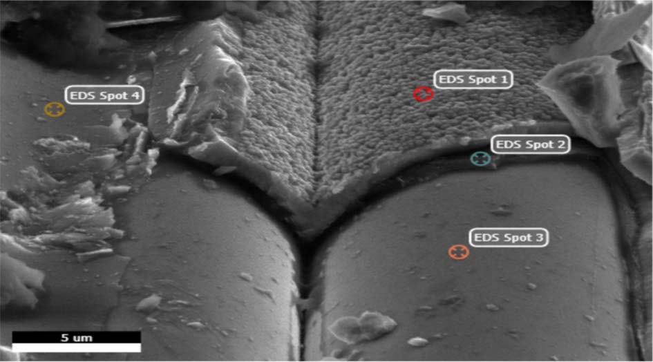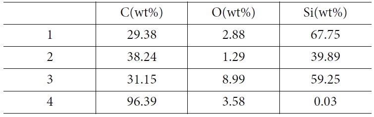 Table 2는 EDAX 분석 결과이다. 1번 위치는 SiC성분으로 CVI 공정에 의해서 형성된 SiC매트릭스이며, 2번은 SiC와 탄소성분이 나타나 이는 PyC코팅 층과 SiC코팅 층으로 보이며, 그리고 3번은 SiC 섬유이다. 그리고 4번은 PyC코팅 층으로 확인된다.