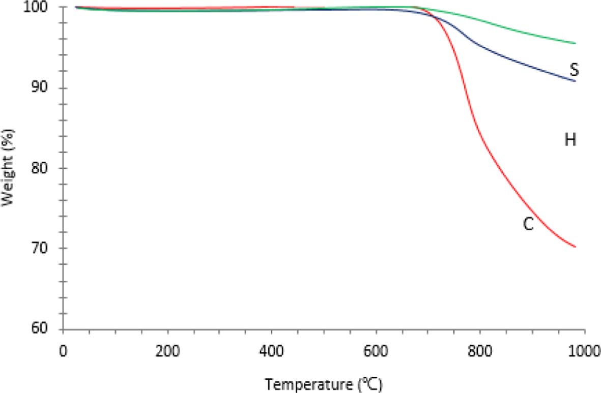 Fig. 6 Thermogravimetric Analysis (TGA) of CMC (C, H, S type) up to 1,000℃ at Air atmosphere |