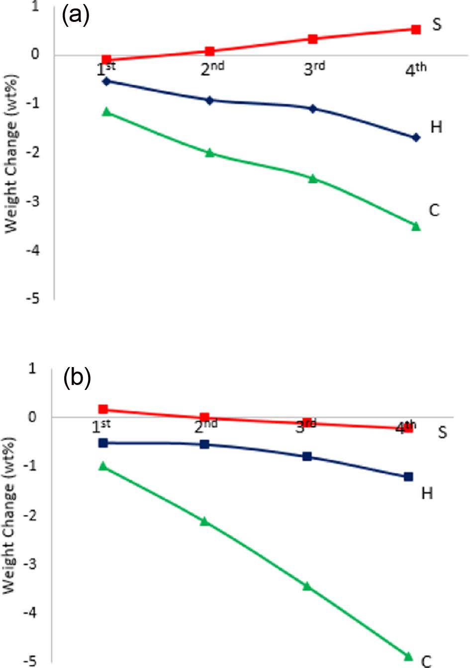 Fig. 7은 650oC와 950oC 공기분위기에 노출한 후에 상온으로 급냉각하는 열충격싸이클을 4회 반복한 조건에서 얻은 중량변화 결과이다. 650℃ 조건(a)에서 C형과 H형 시편은 열충격싸이클이 반복함에 따라서 중량 감소 현상이 뚜렷하게 나타났다. 특히 탄소섬유를 사용한 C형 복합재는 H형에 비하여 약 2배 감소하였다. 반면에 탄화규소섬유로 제작한 시편 S형은 열충격싸이클 횟수가 증가하면 도리어 중량이 증가하고 있다. 950℃(b) 노출 시험 조건에서는 3종류의 시편 모두에서 중량 감소를 보여주었다. 이 조건에서도 C형 시편은 650℃ 조건 보다 더 많은 중량이 감소하였다. 그러나 H형 시편은 650℃시험 조건에 비하여 최종 중량 감소가 약 28% 적게 나타났다. 이는 H형에 탄화규소섬유가 포함되어 있기 때문이다. S형은 650℃ 시험 조건에 비하여 950℃ 조건에서 약 59% 더 감소하였다. 1회 노출시험에서는 중량이 약간 증가하다가 3회 시험부터는 감소 현상이 일어나기 시작했다. 950℃ 노출 시험에서 C형 시편은 4.9%, H형은 1.21%, 그리고 S형은 단지 0.2% 감소하였다. 이는 탄화규소섬유가 산화에 강한 특성을 갖고 있음을 알 수 있다. 하이브리드형에서 특히 950℃의 시험에서는 중량감소가 C형과 큰 차이가 있다. 이는 TGA의 결과와도 일치한다.
