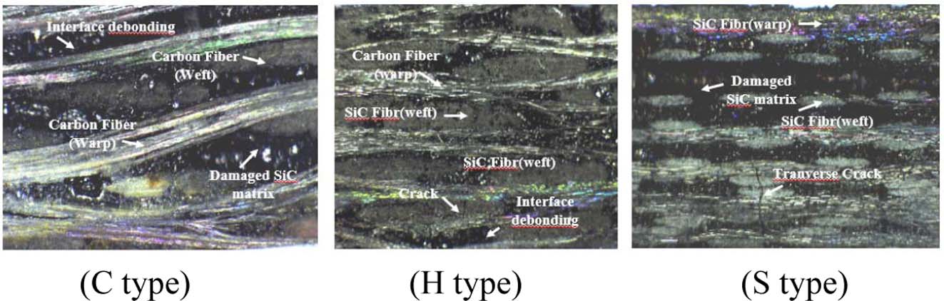 열충격싸이클을 겪은 시편에 대하여 상온에서 3-점 굴곡시험을 하였다. Fig. 8은 950℃ 조건에서 처리한 시편들의 굴곡시험 후의 시편의 광학현미경 사진이다. C형의 시편은 굴곡 하중에 의해 탄소섬유 번들(Bundle)의 변형이 크게 일어난 것을 볼 수 있으며, 가장 아래층에서 섬유 번들이 파단된 상태를 볼 있다. 또한 위사 방향의 섬유 번들과 SiC매트릭스 계면에서 분리가 일어났음도 보인다. H형 시편에서도 섬유 번들의 변형은 크지 않지만 약간 발생하였고, 그리고 C형 시편과 같이 가장 아래층에서 섬유-매트릭스에서 계면 분리가 일어났다. S형 시편에서 섬유 번들의 변형은 보이지 않는다. 경사 방향의 섬유 번들과 매트릭스 사이에서의 계면 분리가 관찰되며, 그리고 하중 방향으로 발생한 크랙이 경사 방향의 섬유 번들을 통과하였음을 볼 수 있다. S형 시편은 변형이 크지 않은 것으로 보인다.