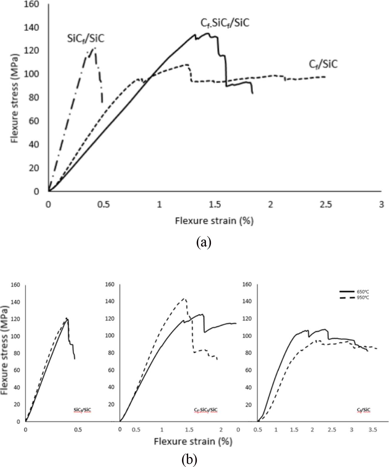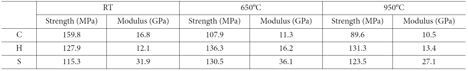 Table 3은 3-점 굴곡시험의 파단강도와 탄성율의 측정결과이다. 상온에서의 굴곡강도는 Cf/SiC(C형)가 가장 높으며, SiCf/SiC(S형)가 가장 낮은 값을 나타냈다. 반대로 탄성율은 S형이 가장 높다. H형 시편은 C형과 S형의 굴곡강도는 중간 값을 나타내었으나, 탄성율은 낮게 나타났다. 이는 아마도 이 시편이 갖고 있는 많은 기공율과 큰 기공 크기에 기인할 수 있다.